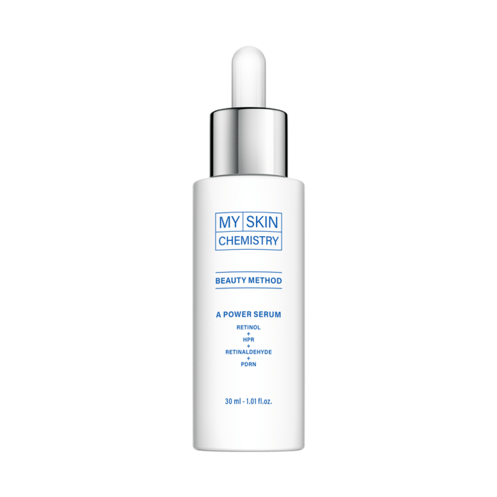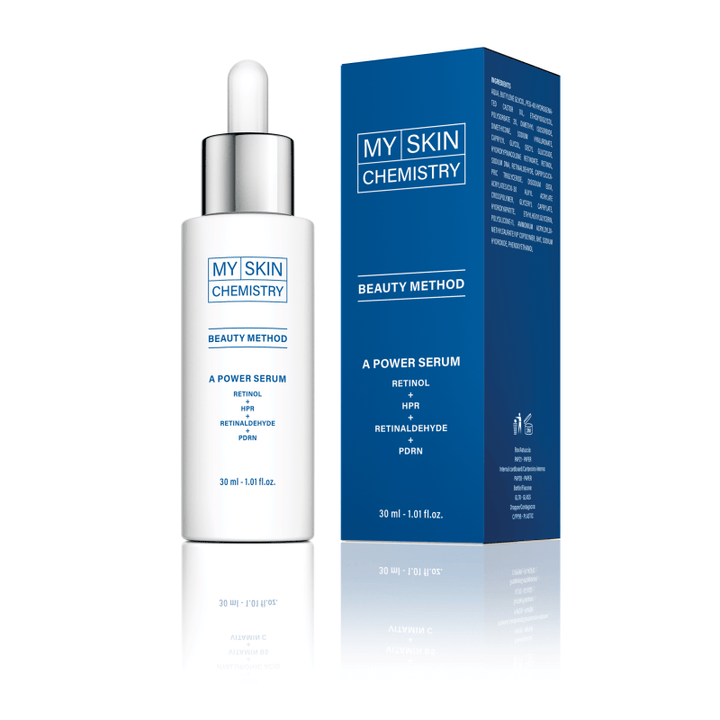 My Skin Chemistry, A Power Serum es un suero facial con una potente formulación de tres diferentes retinoides, Ácido Hialurónico patentado y PDRN. Diseñado para revitalizar y rejuvenecer tu piel, mejora la textura, reseca las líneas finas y deja tu piel suave y firme. Además, contribuye al engrosamiento de la dermis, reduce las arrugas y las manchas, y ayuda en la reparación de tejidos.