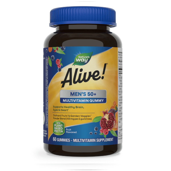 Alive!® Multivitamínico para Hombres 50+ de Nature's Way está formulado para satisfacer las necesidades nutricionales de los hombres mayores de 50 años. Estas deliciosas gomitas contienen 15 vitaminas y minerales esenciales, incluyendo el complejo completo de vitamina B para ayudar a convertir los alimentos en energía celular, apoyando la salud del corazón, la función muscular, la salud ocular y el sistema inmunológico. Además, están elaboradas con pectina de origen vegetal, sin gelatina, y son libres de gluten, lácteos, huevos, maní, trigo o ingredientes derivados de la levadura.