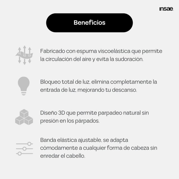 - Oscuridad total: diseño ergonómico 3D que bloquea la luz y favorece el descanso.
