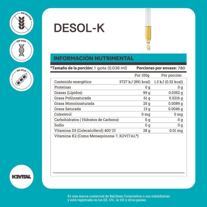 Desol-K de Matter combina vitamina D3 (400 UI) y vitamina K2 (10 mcg) en gotas para apoyar la salud ósea y el sistema inmunológico. Esta fórmula líquida práctica facilita la absorción de nutrientes clave que contribuyen al fortalecimiento de huesos y dientes, mientras favorece la correcta utilización del calcio y la protección cardiovascular.