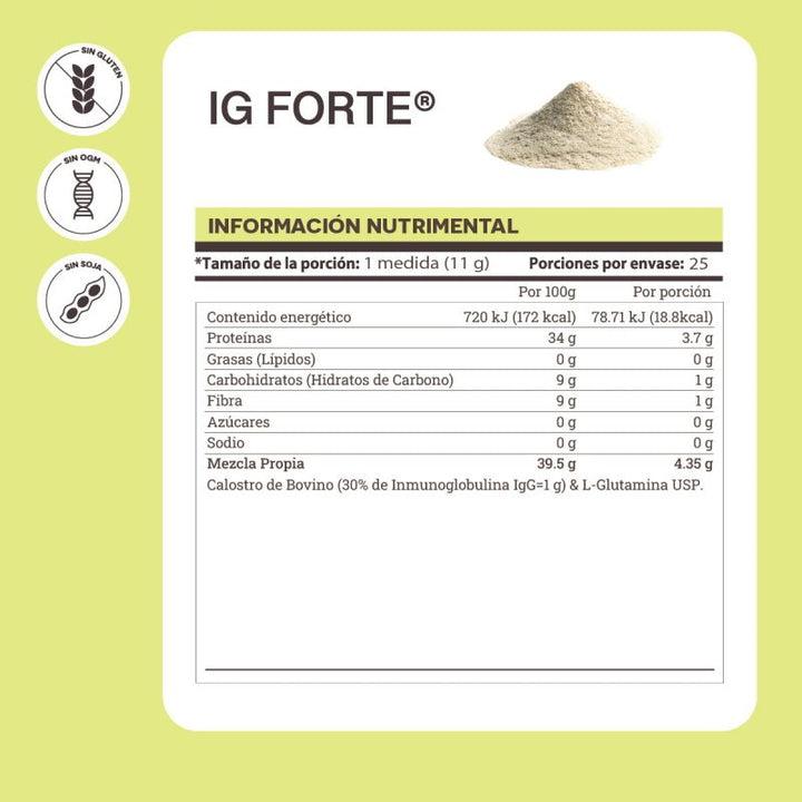 IG-Forte es un concentrado avanzado de inmunoglobulinas y péptidos bioactivos derivados de suero y calostro bovino, diseñado para fortalecer el sistema inmunológico y mejorar la salud intestinal. Contiene proteínas naturales, L-Glutamina y extractos naturales sin azúcares añadidos, que ayudan a regular inflamaciones, reparar tejidos y mantener la barrera intestinal, promoviendo el bienestar general de forma natural y efectiva.