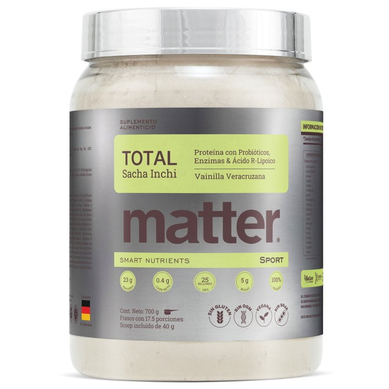 Matter, Total Sport: Vainilla Veracruzana, la proteína 100% vegana que mejora tu bienestar. Con 23 gramos de proteína y 0.2 gramos de carbohidratos, es libre de azúcar. Contiene la potencia de la semilla Sacha Inchi, enzimas y probióticos para optimizar tu digestión y absorción de nutrientes. Elige Total Sport para una formulación exclusiva.