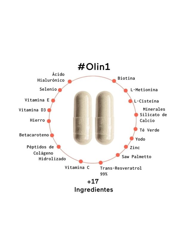 Olin Women's Nutrition es un suplemento para el cabello en cápsulas, formulado con más de 17 ingredientes clínicamente respaldados como péptidos de colágeno, saw palmetto, biotina, zinc y vitamina D3. Su fórmula avanzada apoya el crecimiento del cabello, fortalece el tallo capilar y mejora la salud del cuero cabelludo. Ideal para mujeres que buscan una nutrición completa para cabello, piel y uñas.