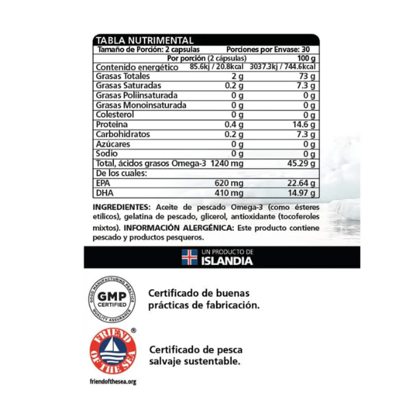 - Alto contenido de Omega: 3 con más de 1,000 mg de EPA y DHA por porción.