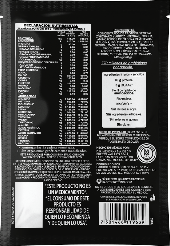 - 30 g de proteína vegetal por porción: Apoya el desarrollo y la recuperación muscular.