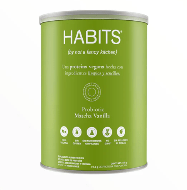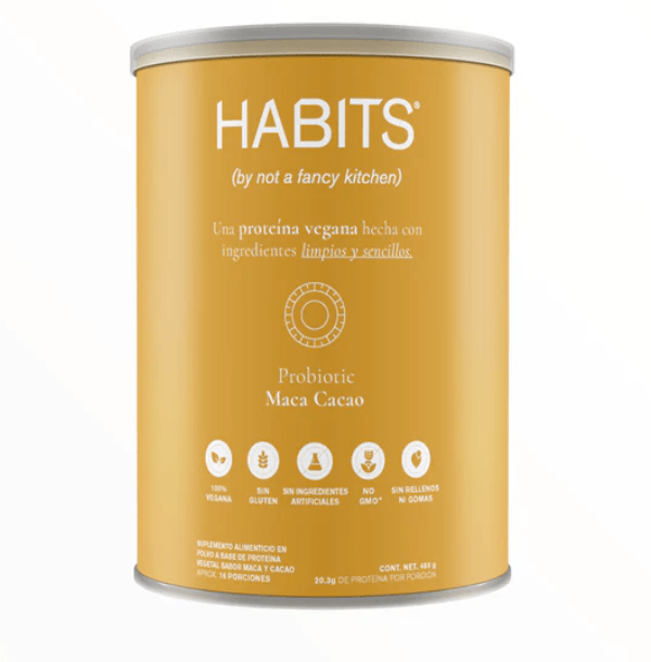 Habits Proteína ProBiótica con Maca y Cacao combina ingredientes de origen 100% vegetal como la maca peruana y el cacao natural, con 610 millones de probióticos por porción que apoyan la salud digestiva. Es libre de gluten, sin azúcar añadida, Kosher y no contiene gomas, espesantes ni ingredientes artificiales. Ideal para quienes buscan una opción nutritiva y funcional para complementar su alimentación diaria.