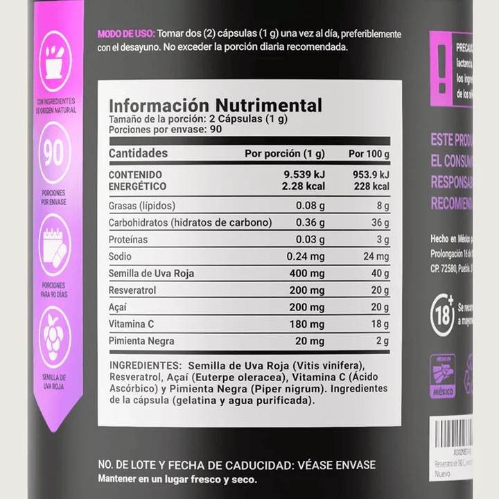 - Sinergia de ingredientes naturales: la mezcla de resveratrol, uva roja, açaí y vitamina C potencia el bienestar integral.