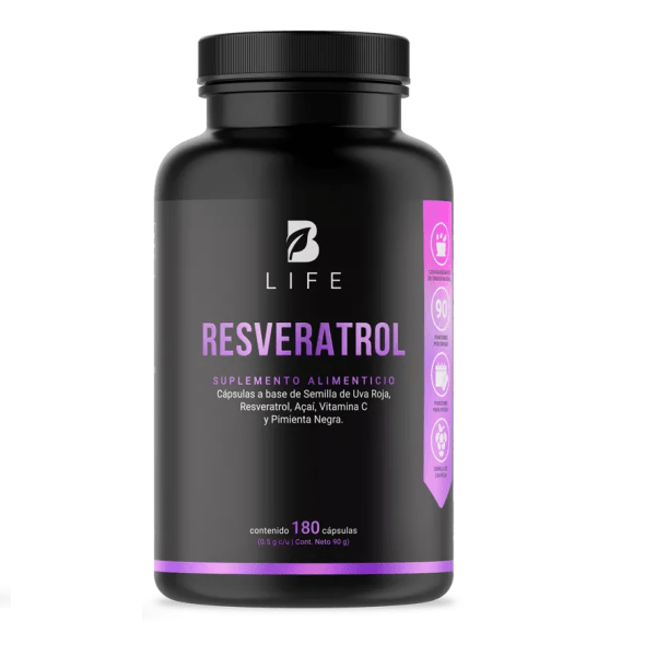 Resveratrol B Life® 500 mg es un suplemento antioxidante de alta potencia que combina resveratrol puro, semillas de uva roja, açaí y vitamina C, enriquecido con pimienta negra para mejorar la absorción. Su fórmula avanzada ayuda a proteger las células del daño oxidativo, apoyar la salud cardiovascular y cerebral, y promover un envejecimiento saludable con ingredientes naturales y biodisponibles.